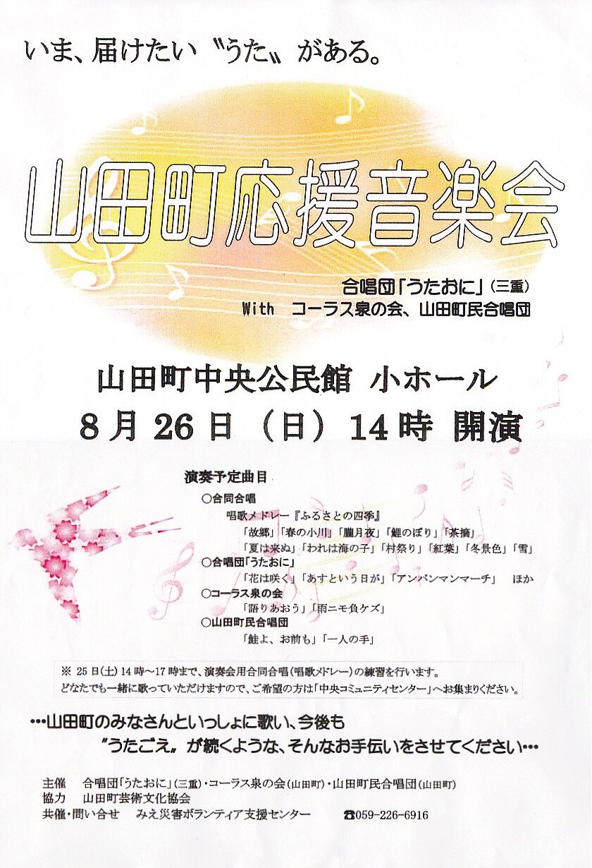 8月26日(日)の14時から、山田中央公民館(小ホール)で山田町応援音楽会が開催されます。