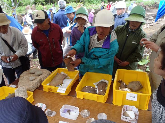 テントの下では土器や矢じり、貝などの出土品が展示されていました。