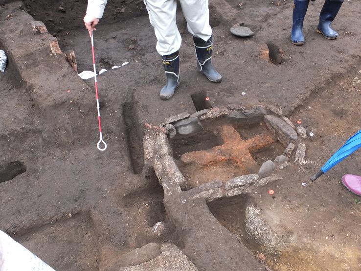 かまどの跡です。(十字部分が当時の底面です。調査のためさらに掘られました)