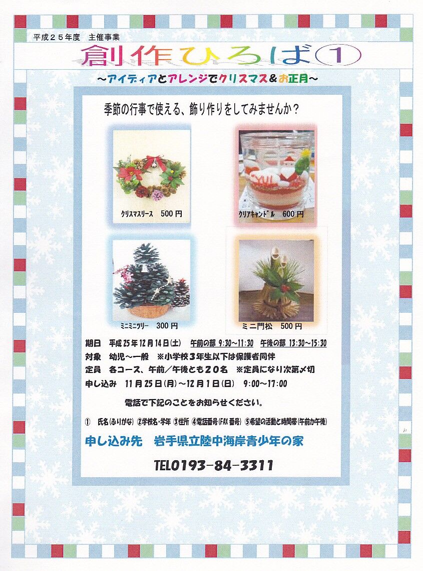 12月の青少年の家・創作ひろばのお知らせです。