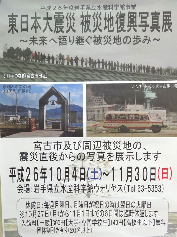 2014年10月07日 東日本大震災 被災地復興写真展 宮古市及び周辺被災地の震災直後からの写真を展示ししています。 場所 岩手県立水産科学館ウォリヤス(63-5353) 日時 平成26年10月4日(土)~ 11月30日(日) 休館日 毎週月曜日。月曜日が祝日の時は翌日の火曜日 *10月27日(月)から11月1日までの6日間は臨時休業 入館料 一般300円 大学・専門学校生140円 高校生以下無料 団体割引有(20名以上) (千) 「お知らせ」カテゴリの最新記事 < 前の記事次の記事 > コメント コメントフォーム 名前 コメント 評価する リセット リセット 顔 星 投稿する 情報を記憶