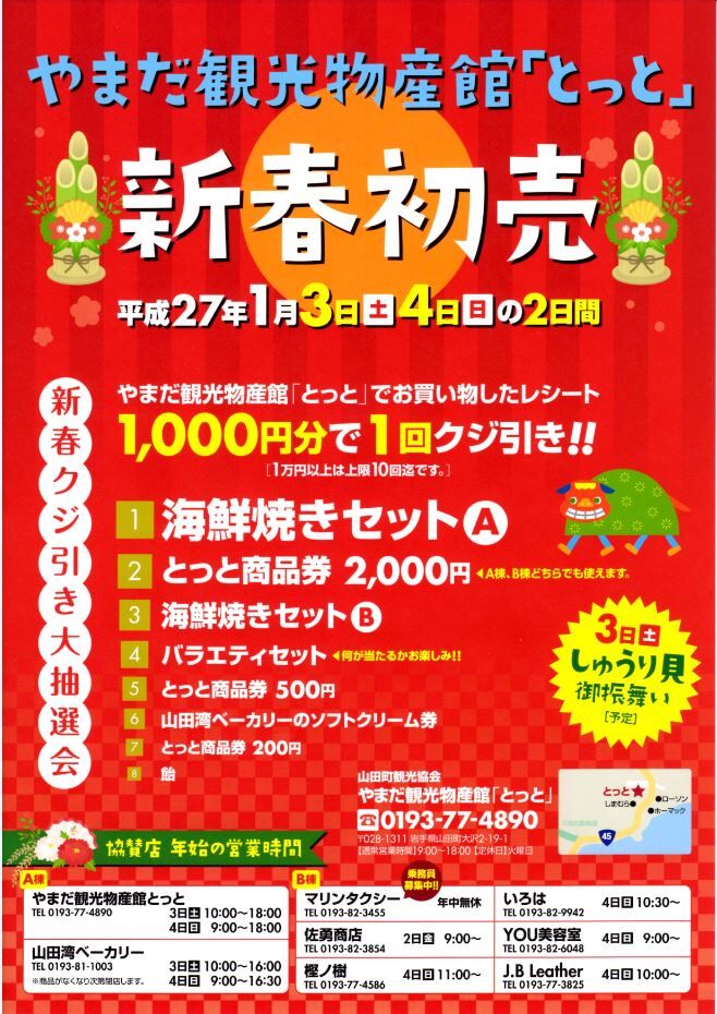 2015年01月01日 とっとの初売り! やまだ観光物産館「とっと」のお知らせです。 1月3日(土)4日(日)の2日間新春クジ引き大抽選会が行われます(年始の営業時間はチラシをご確認ください↓) とっとでお買い物したレシート1,000円分で1回クジ引き。 海産物に商品券などがあたります今年初めの運試しにいかがですか 1月3日(土)は朝10:00オープン。そして、「しゅうり貝のおふるまい(予定)」があります! ぜひお立ち寄りください (福) 「とっと」カテゴリの最新記事 < 前の記事次の記事 > コメント コメントフォーム 名前 コメント 評価する リセット リセット 顔 星 投稿する 情報を記憶