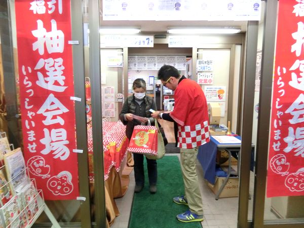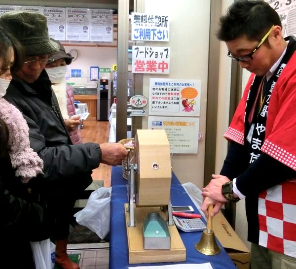 2015年01月02日 道の駅やまだ福袋抽選会 道の駅やまださんでは今日と明日、福袋抽選会開催中です 開店とともにたくさんのお客さんが来店。 福袋がどっさり。 さっそく当たった方が。 白い玉があたりです!父さんも当たりました 「お得な品物が入ってますよ」と道の駅の方もおすすめの福袋、1000円分のお買い物で一回抽選できます。 今日明日道の駅やまだの営業時間は 9:30~17:30 です。 気を付けていらしてください。 (千) 「日記」カテゴリの最新記事 < 前の記事次の記事 > コメント コメントフォーム 名前 コメント 評価する リセット リセット 顔 星 投稿する 情報を記憶