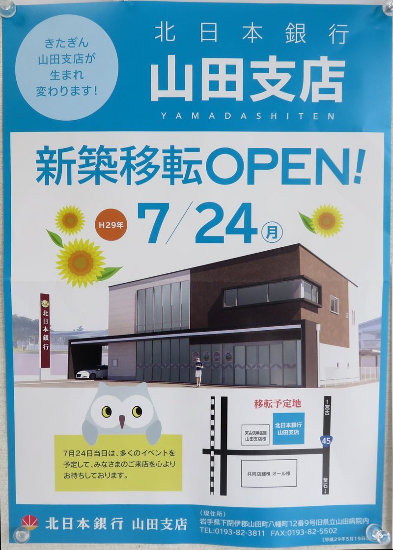 2017年07月23日 北日本銀行移転のお知らせ 7月24日(月)北日本銀行山田支店が新築移転OPENします。 場所はびはんオールの道路を挟んで向かい側、宮古信用金庫の隣です。 (千) 「お知らせ」カテゴリの最新記事 < 前の記事次の記事 > コメント コメントフォーム 名前 コメント 評価する リセット リセット 顔 星 投稿する 情報を記憶