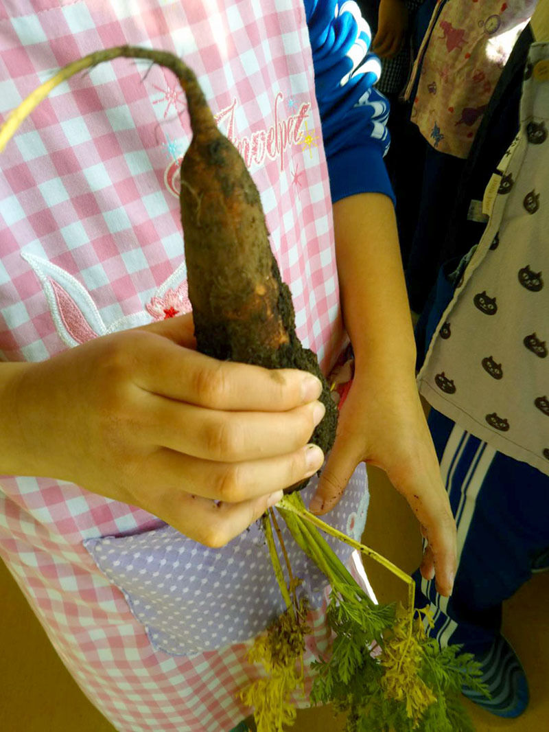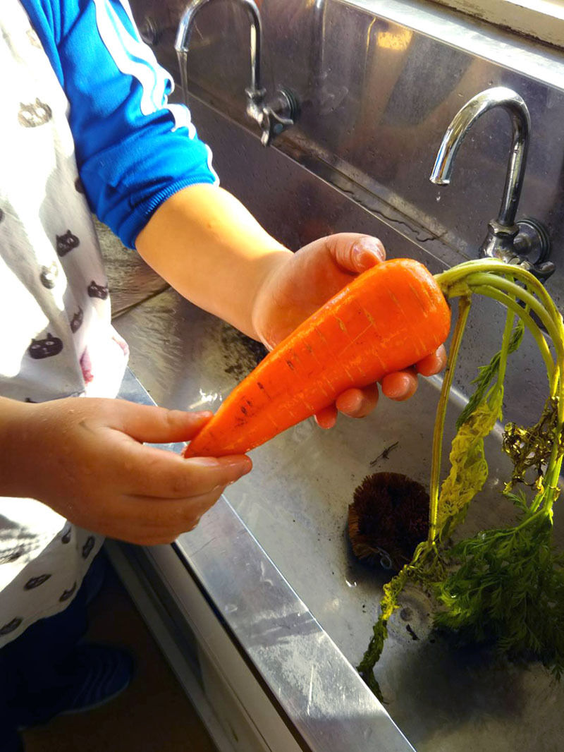 店:前日畑で子供たちが収穫した人参、カブを洗います。