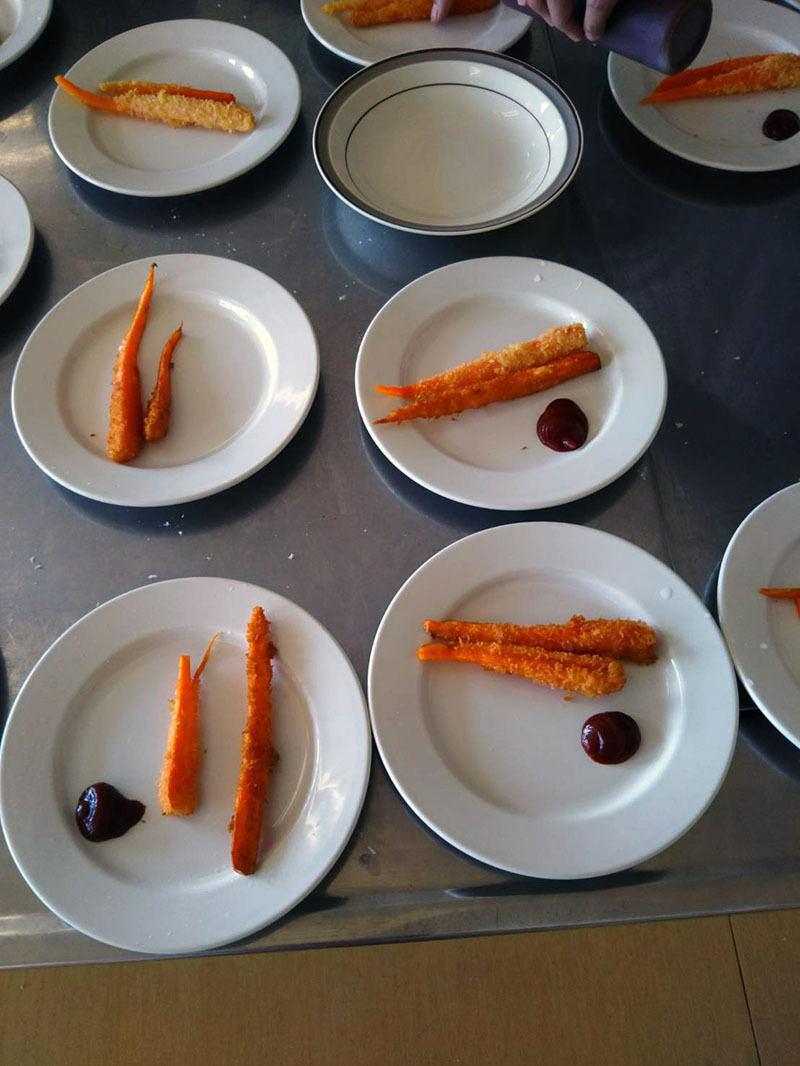 メニューは「エビフライ風人参フライ」「カボチャのニョッキ」「カブとしゅうりのスープ」です。