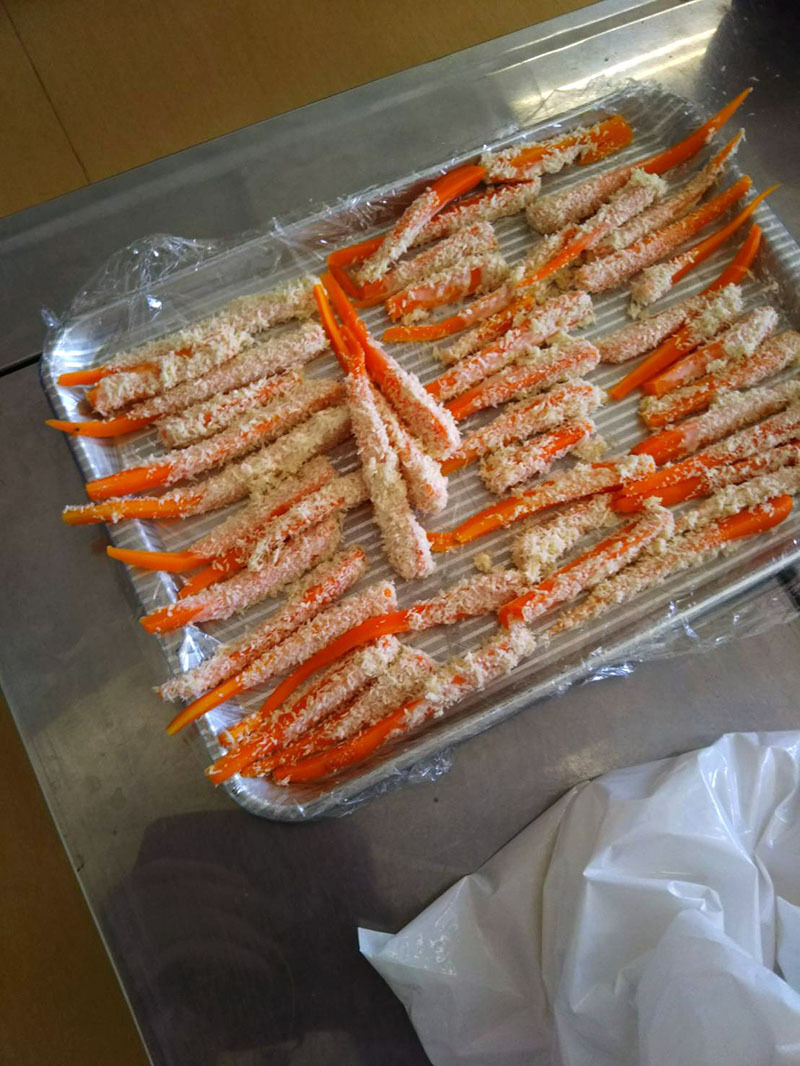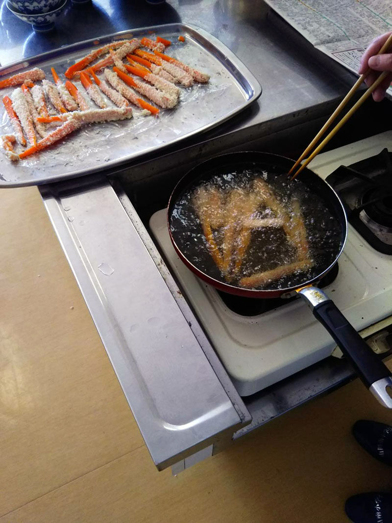 店:人参は細く切って、小麦粉を水で溶いたものにつけてパン粉を付けてエビフライに見せます。