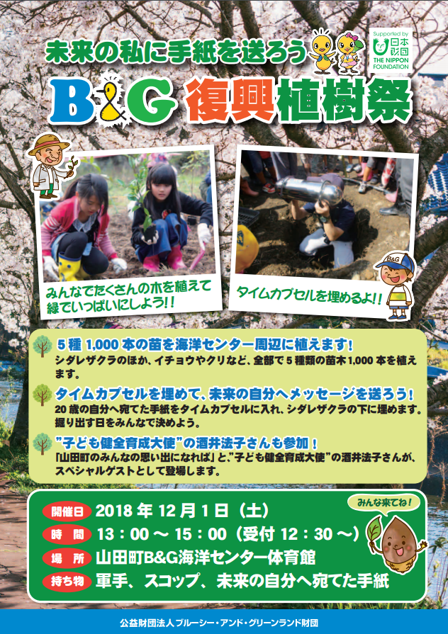 B&G財団が被災地支援一環として企画、1,000本の苗を植え、子供たちのタイムカプセルを埋めます。