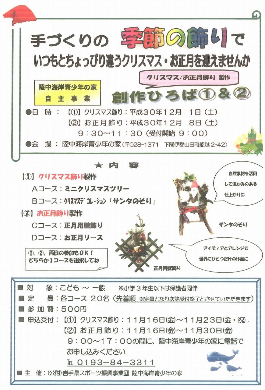 うっかりしていまして、12月1日(土)開催のクリスマス飾りの方は〆切が過ぎてしまっていました。m(__)m