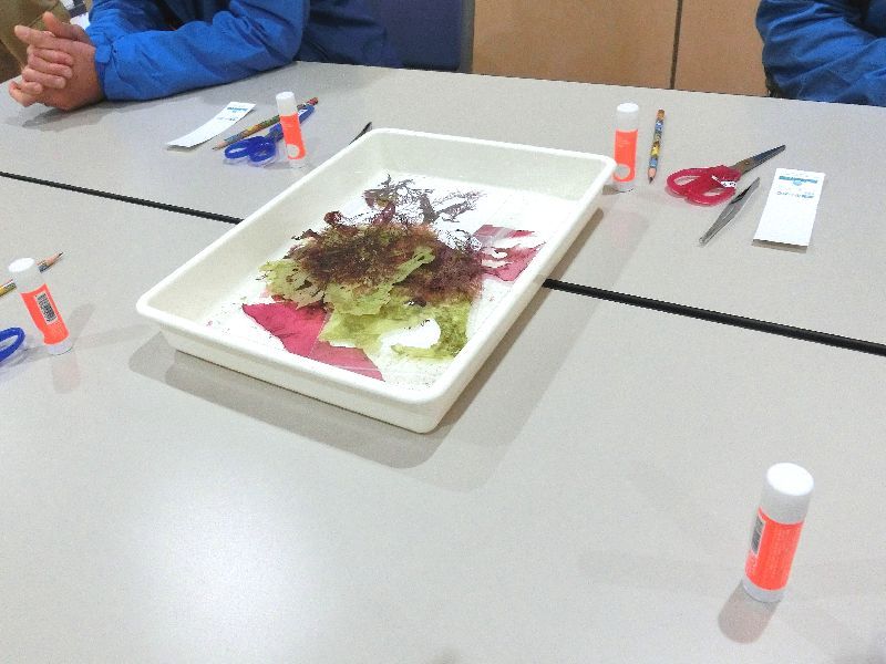 しおりの作り方の他に、生物としての海藻について。海「藻」と海「草」の違いや普段食べるワカメや海苔、褐色か紅色か、なぜそうなのか、などなど教えていただきました。