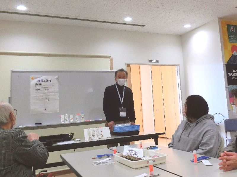 最後にワークショップです。「海藻おしば」でしおりを作ります。指導は鯨と海の科学館の道又さんです。