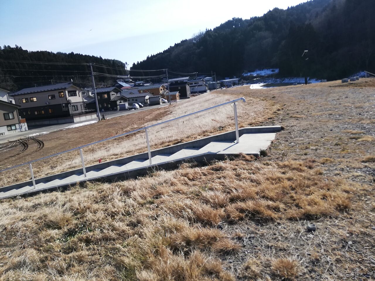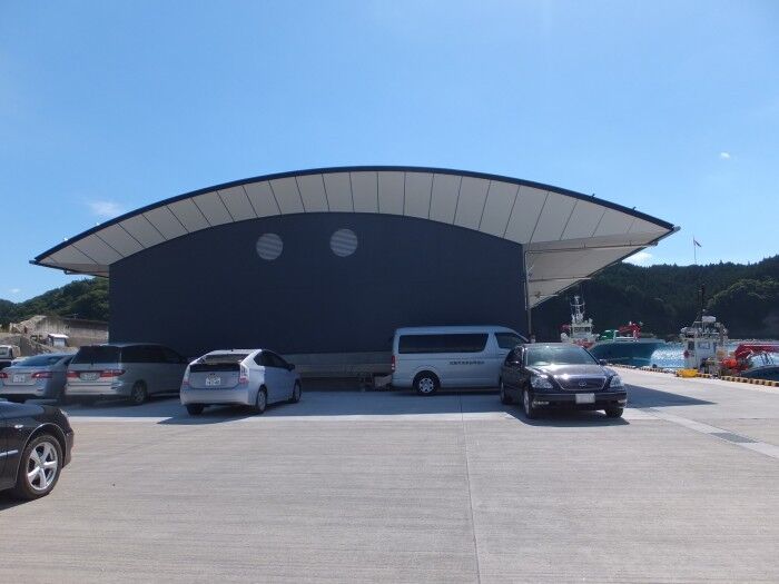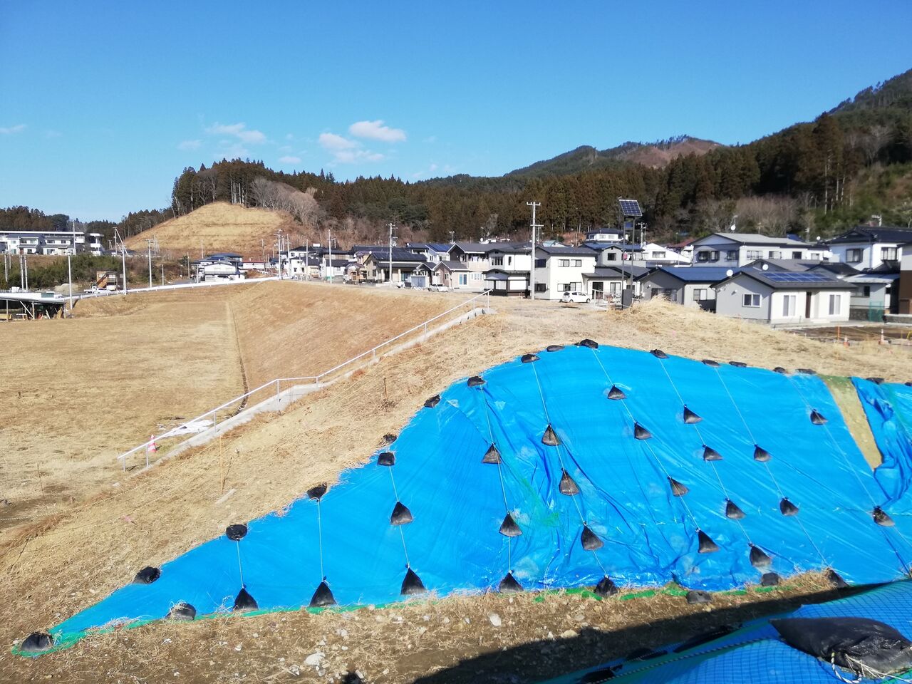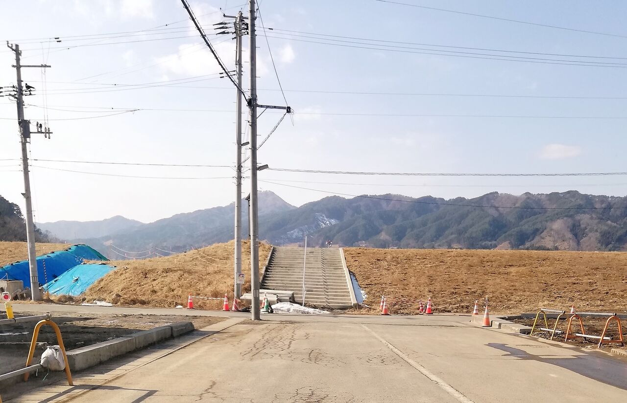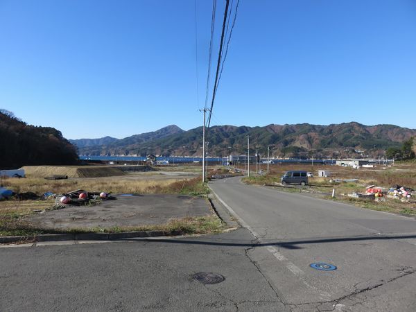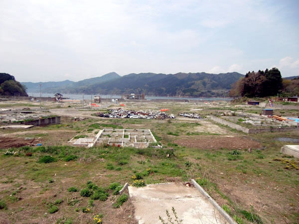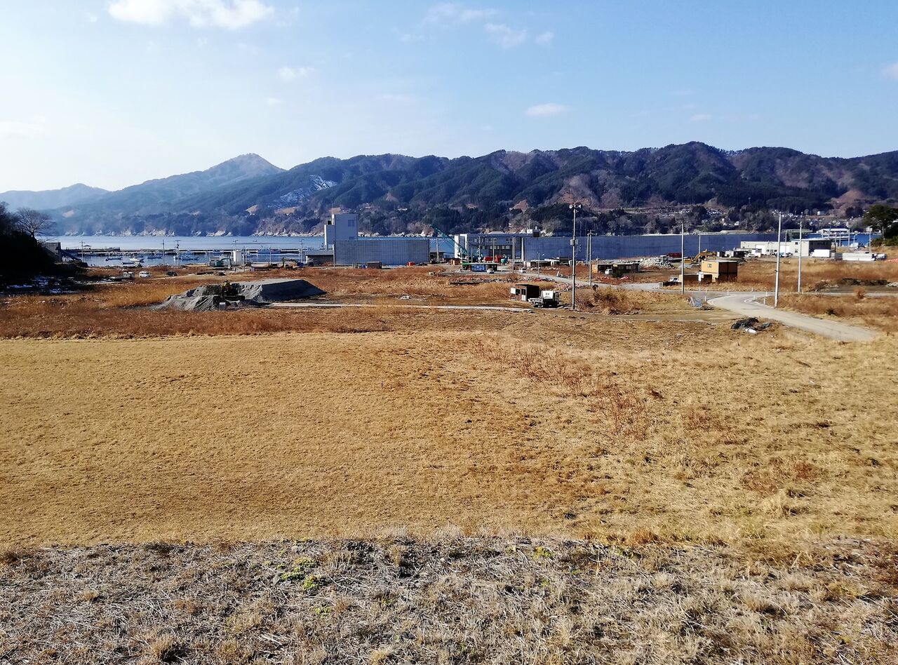 田の浜地区は震災後居住区を高台に移し、住宅地と防潮堤の間は非住居地となり公園広場として整備しました。