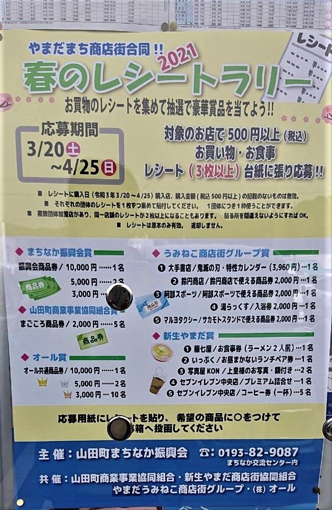 2021年03月30日 春のレシートラリーはじまってます やまだまち商店街合同「春のレシートラリー」が3月20日からはじまっています 対象のお店で500円以上(税込み)のお買い物や食事のレシートを3枚以上台紙に貼って応募すると、 豪華賞品が抽選で当たります 普段レシートを捨てちゃっていませんか? いつものお買い物で豪華賞品を当てましょう。 台紙は対象のお店にございますよ 期間は3月20日(土)~4月25日(日)です。 お問い合わせ 山田町まちなか振興会 0193-82-9087 (千) 「お知らせ」カテゴリの最新記事 < 前の記事次の記事 > コメント コメントフォーム 名前 コメント 評価する リセット リセット 顔 星 投稿する 情報を記憶