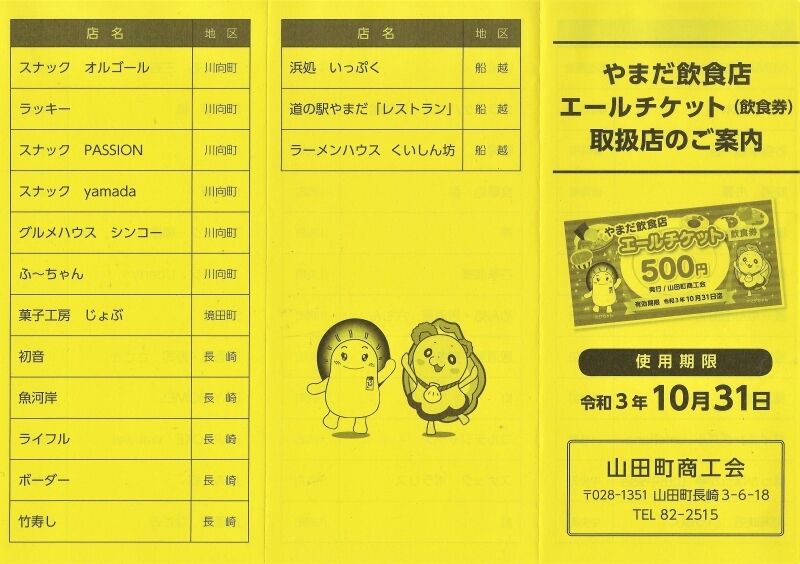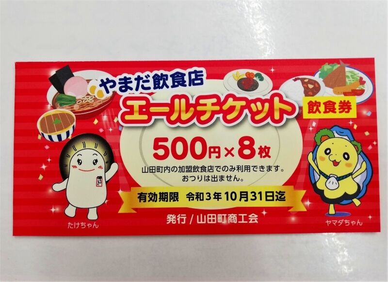 山田で飲食するのにお得なチケット、やまだ飲食店「エールチケット(飲食券)」が4月20日より山田商工会で販売中です