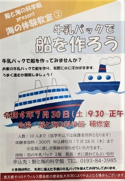2022年07月12日 牛乳パックで船を作ろう 鯨館海の体験教室 夏休みが来ますね。 工作はなにを作ろう…そうだ、鯨と海の科学館の体験教室に行こう 令和4年7月30日(土) 時間:9:30~正午 会場:鯨と海の科学館 研修室 人数:10人まで (低学年以下は保護者同伴となります) 体験参加料:300円 申込締切日:7月28日(木)まで ※定員に達し次第締め切り 持物:空の牛乳パック2個 服装:水にぬれてもよい恰好 申込は鯨と海の科学館 0193-84-3985 までよろしくお願いします。 (千) 「お知らせ」カテゴリの最新記事 < 前の記事次の記事 > コメント コメントフォーム 名前 コメント 評価する リセット リセット 顔 星 投稿する 情報を記憶