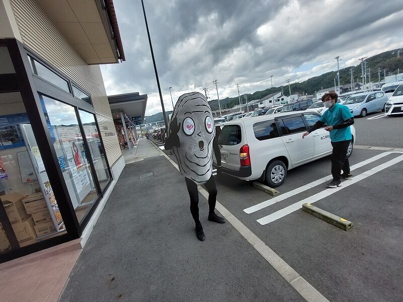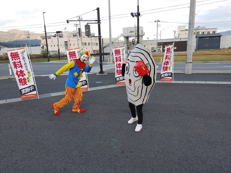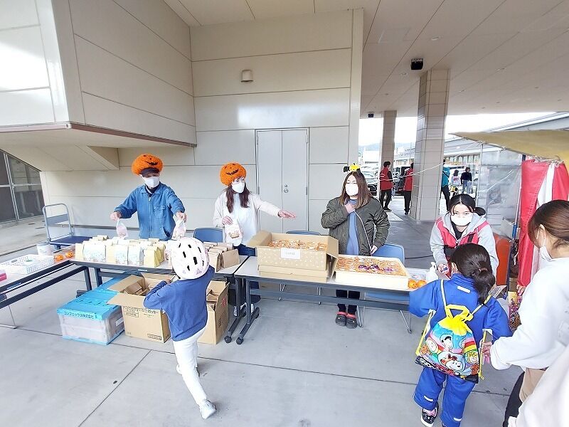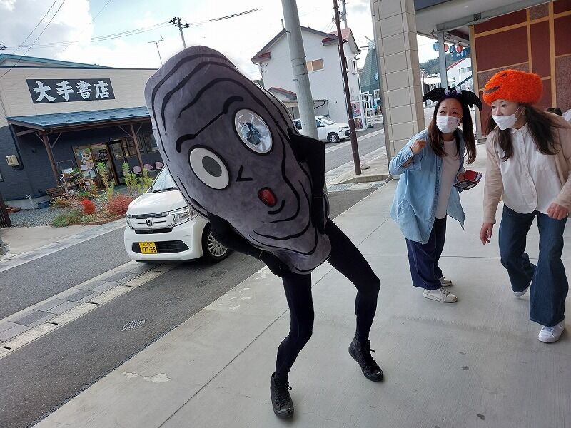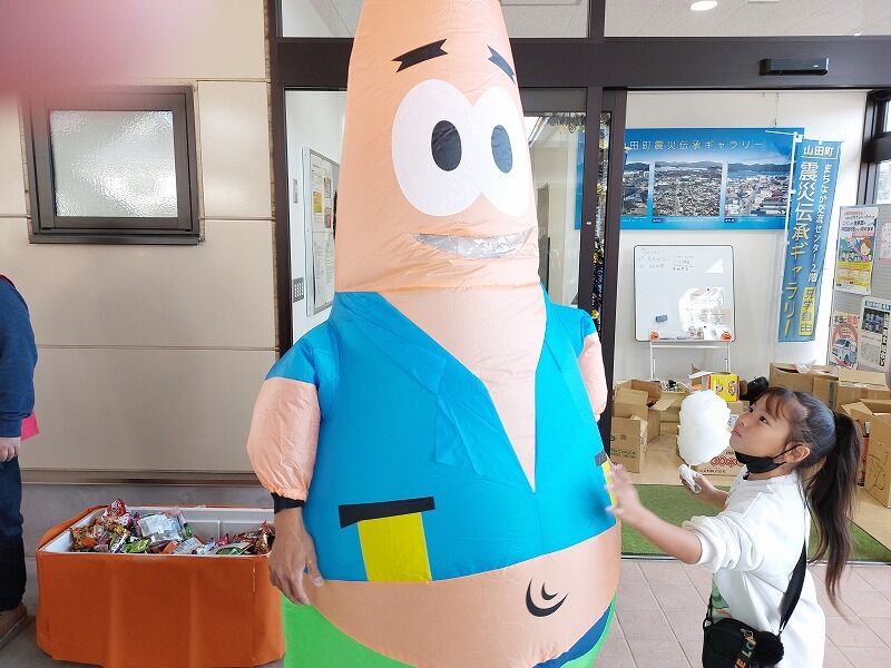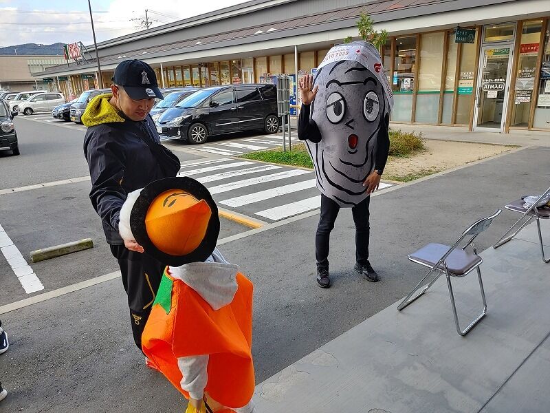 スタンプがもらえる所に仮装した商工会青年部の人たちがいます。