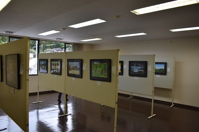 公民館の入口を入って正面壁に絵画コンクール作品