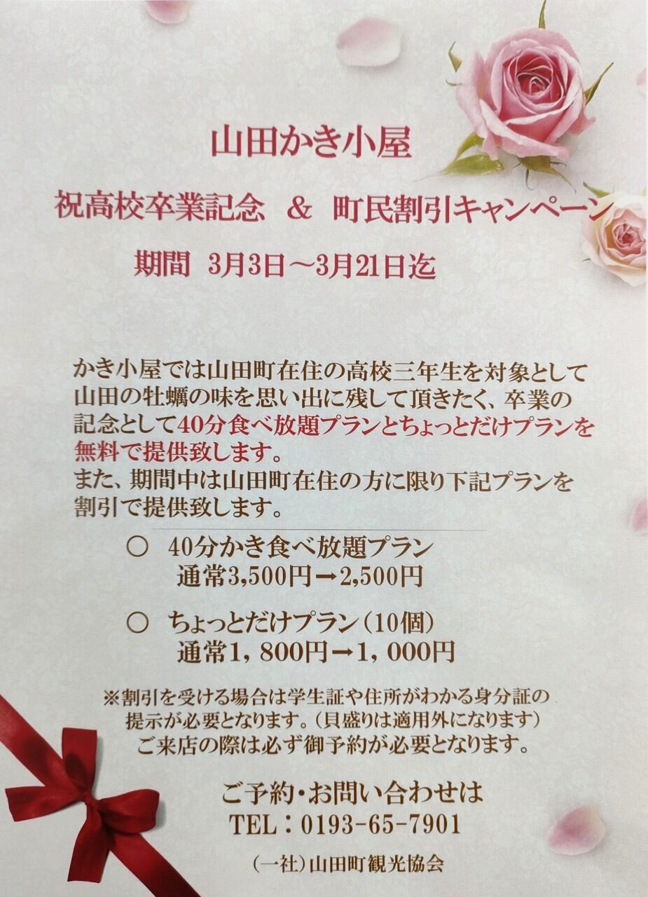 山田町在住の高校三年生を対象とし山田の牡蠣の味を思い出に残していただきたく、卒業の記念として40分食べ放題プランとちょっとだけプランを無料で提供いたします。