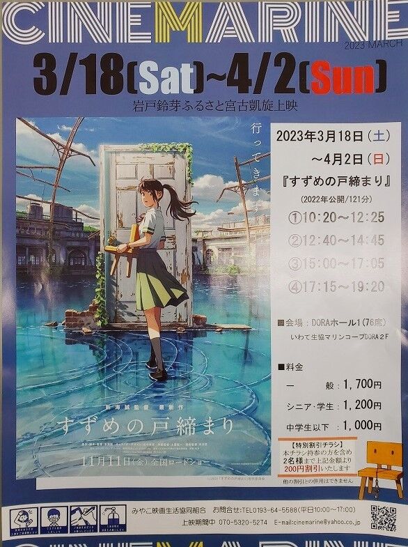 2023年03月02日 おばんですいわて 放送 本日!! NHK放送 おばんですいわて 18:10~ 織笠展望台に設置した、「すずめの戸締まり」の扉の取材の様子が放送されます 皆さん、ぜひご覧ください まだ、来ていない方「○○の戸締まり」をしにお越しください くじら館の館長、手作りの椅子がありますので、扉と椅子と一緒にパシャリしてみて下さい 3/18(土)~4/2(日)まで 宮古市のみやこシネマリーンで「すずめの戸締まり」上映しますよ~ (福ひ) 「日記」カテゴリの最新記事 < 前の記事次の記事 > コメント コメントフォーム 名前 コメント 評価する リセット リセット 顔 星 投稿する 情報を記憶