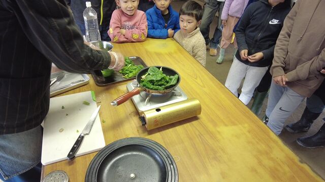 収獲の後は、寒締めほうれん草の美味しい調理。竹松やさんのマスターが、根の近くの