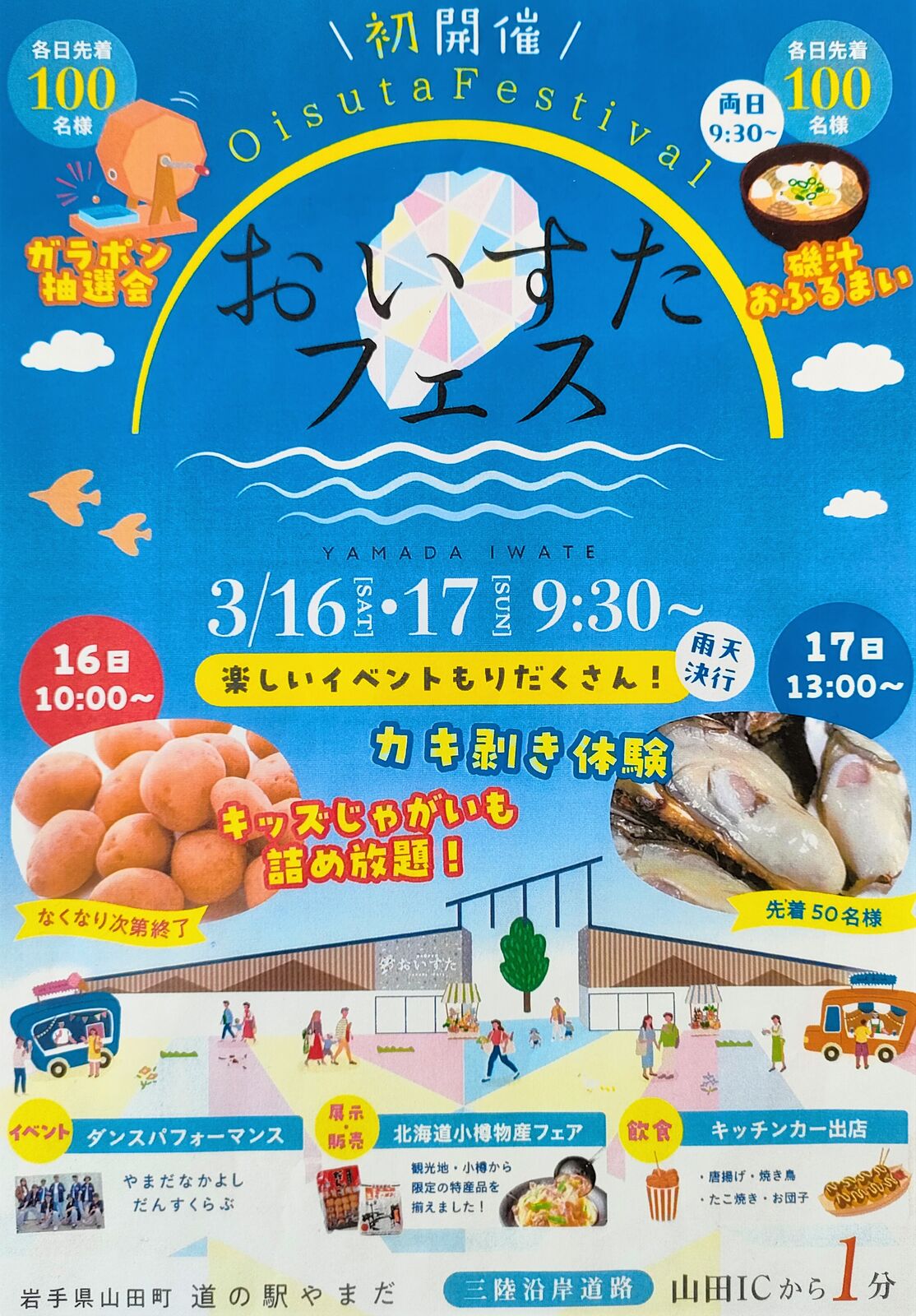 2024年03月12日 おいすたフェスのお知らせ 昨年オープンした道の駅やまだ「おいすた」。今週フェスを開催します。2024年3月16日・17日の二日間のイベントです。おふるまいや体験など、お楽しみが一杯。みんなしていぐべす(千) タグ :#おいすた#フェス#抽選#おふるまい 「道の駅やまだ」カテゴリの最新記事 < 前の記事次の記事 > コメント コメントフォーム 名前 コメント 評価する リセット リセット 顔 星 投稿する 情報を記憶