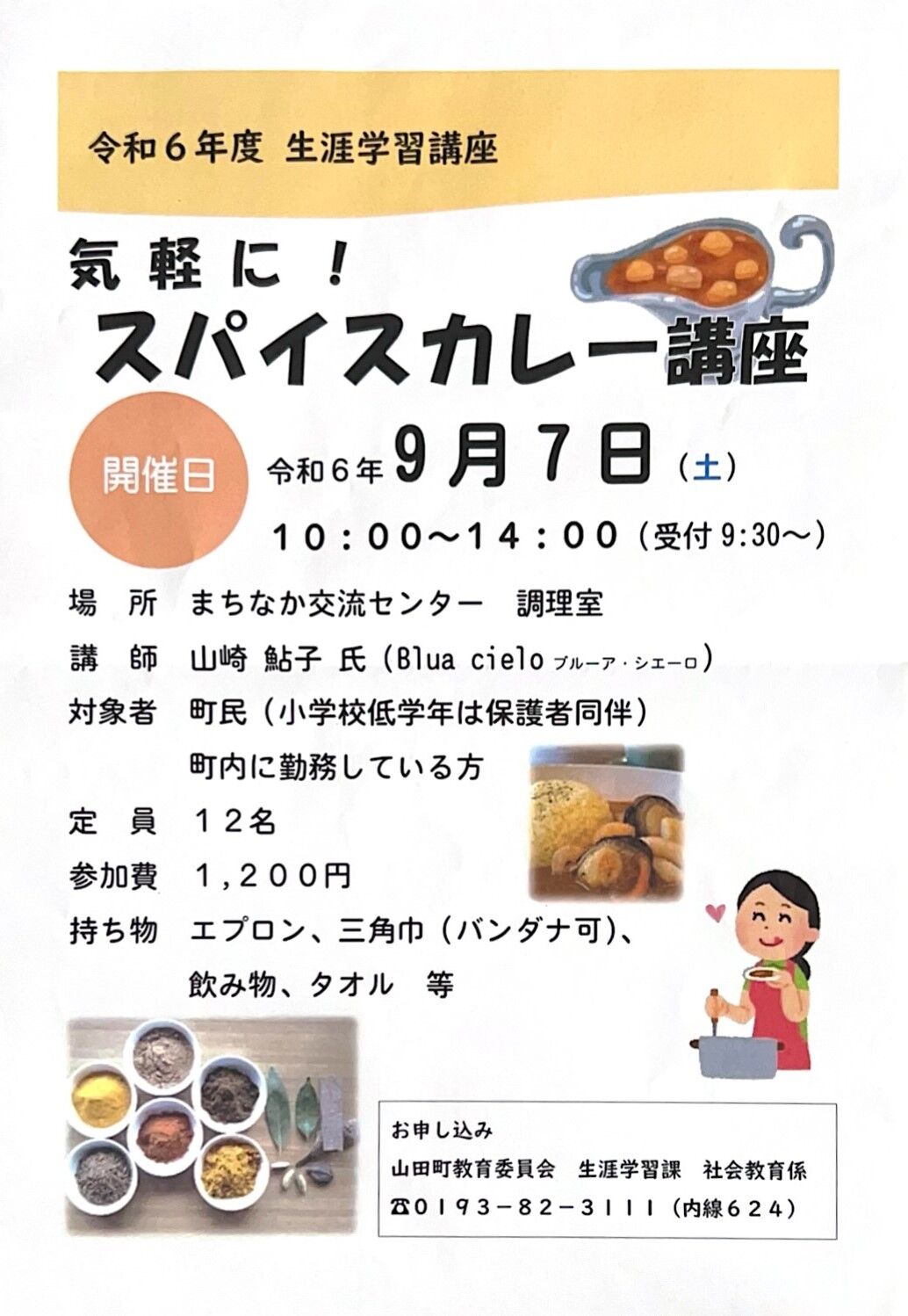 開催日:9月7日(土)場 所:まちなか交流センター 調理室講 師:山崎 鮎子氏(Blua cielo ブルーア・シエーロ)対象者:町民(小学生低学年は保護者同伴) 町内に勤務している方