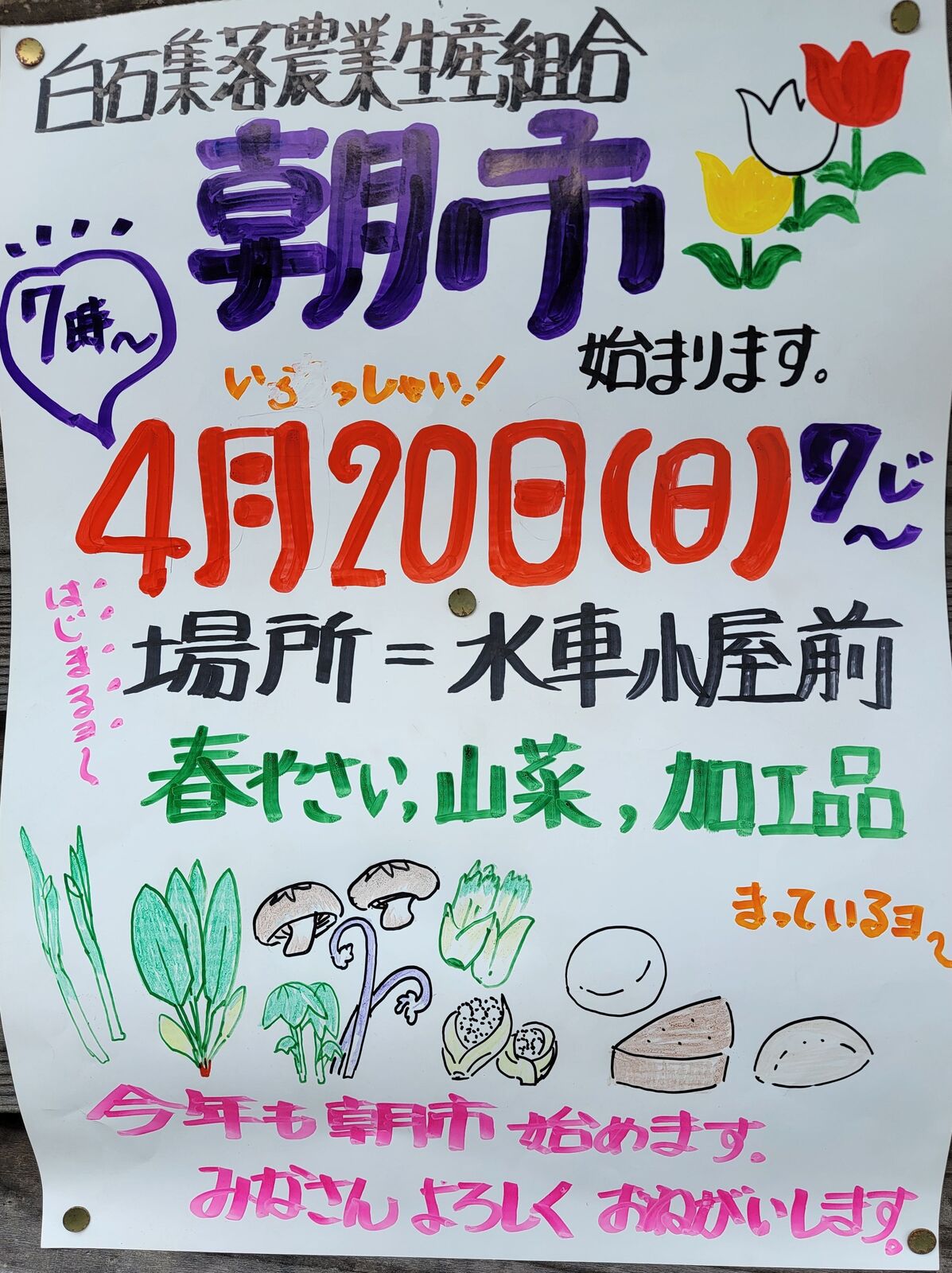 2025年04月13日 白石集落 水車小屋で朝市開催! 白石集落 朝市 始まります。山菜などを出品しますよ!お楽しみですね!(博) タグ :#朝市#白石#春野菜#山菜#白石集落農業生産組合 「白石集落」カテゴリの最新記事 < 前の記事次の記事 > コメント コメントフォーム 名前 コメント 評価する リセット リセット 顔 星 投稿する 情報を記憶