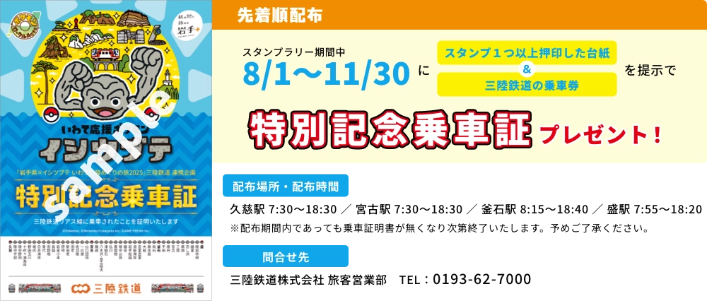 スタンプラリー期間中に『スタンプ1つ以上押印した台紙』&『三陸鉄道の乗車券』を提示してポケふたスタンプラリー特別記念乗車券をプレゼント!