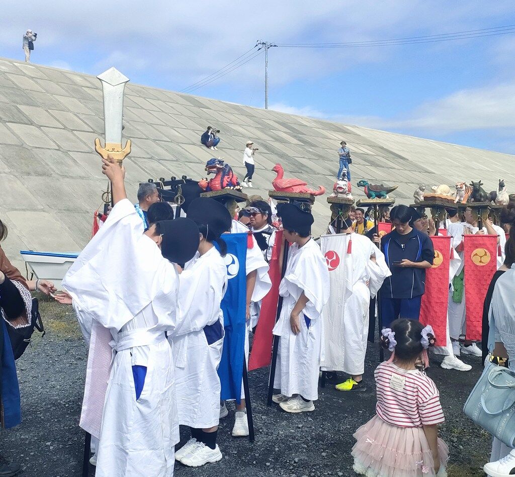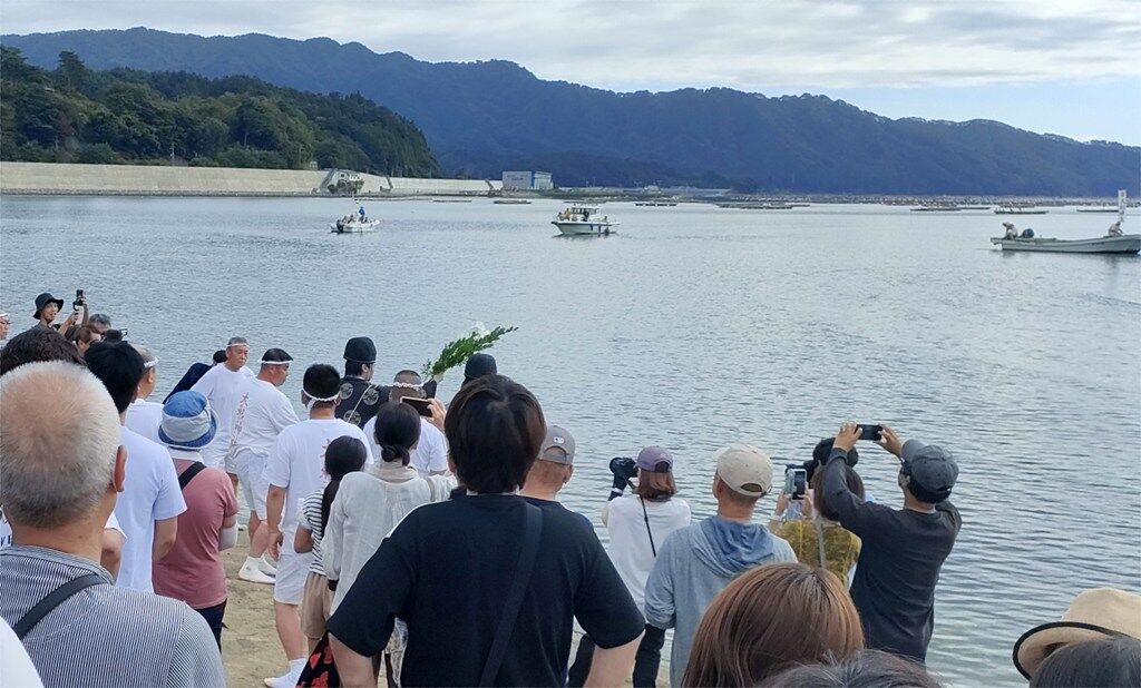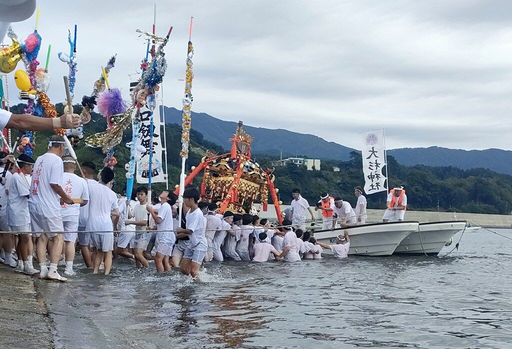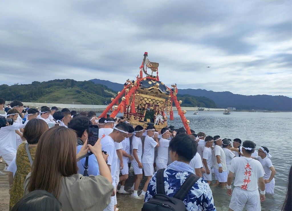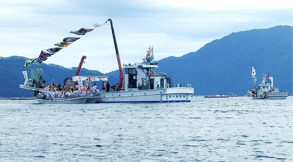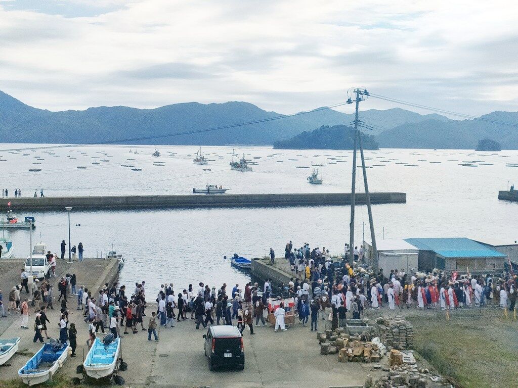 2025年09月20日 2025 山田祭り 大杉神社例大祭 海上渡御 2025年9月15日は大杉神社例大祭が執り行われました。8時半ごろにはすでに海岸に向かうお神輿を見つけて慌てて追いかけました。岸壁ではすでに場所取りが始まっています。神事が執り行われます。ここからスマホ片手に追いかけますドローンも飛んでます。お父さんに抱っこされて特等席。暴れている間に、神輿を乗せる準備。塩撒きの方たち。びっしょり。旗担ぎも頑張って後を追います小船に移ります。ドローンも。曳舟に移ります。山田湾の明神様へ向かっていきました。境田寅舞川向十二支八幡大神楽道の駅やまだでの様子は後でアップします。お楽しみに。(千)こちらも観てね。 タグ :#まつり#お祭り#岩手県山田町#山田の秋祭り#大杉神社例大祭#海に入るお神輿#曳舟#明神崎#明神様#門ぶち 「お祭・歳時記」カテゴリの最新記事 < 前の記事次の記事 > コメント コメントフォーム 名前 コメント 評価する リセット リセット 顔 星 投稿する 情報を記憶