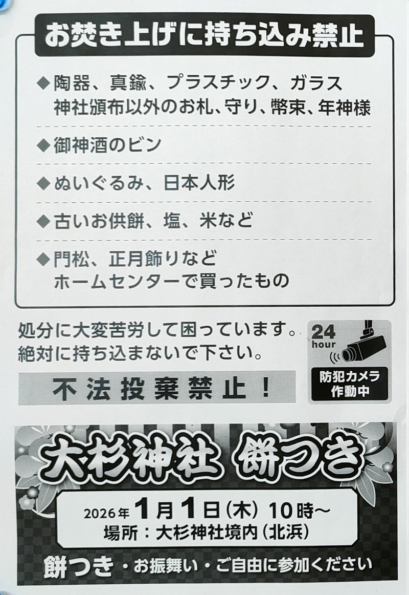 2025年12月19日 元旦 大杉神社からのお知らせ 2026年1月1日 10時から大杉神社境内にて、餅つきとお振舞が行われます。さらに、お焚き上げの持ち込みについて注意事項もございます。よく読んで持ち込みましょう。(千) タグ :#神社#お焚き上げ#餅つき#元旦 「お知らせ」カテゴリの最新記事 < 前の記事次の記事 > コメント コメントフォーム 名前 コメント 評価する リセット リセット 顔 星 投稿する 情報を記憶