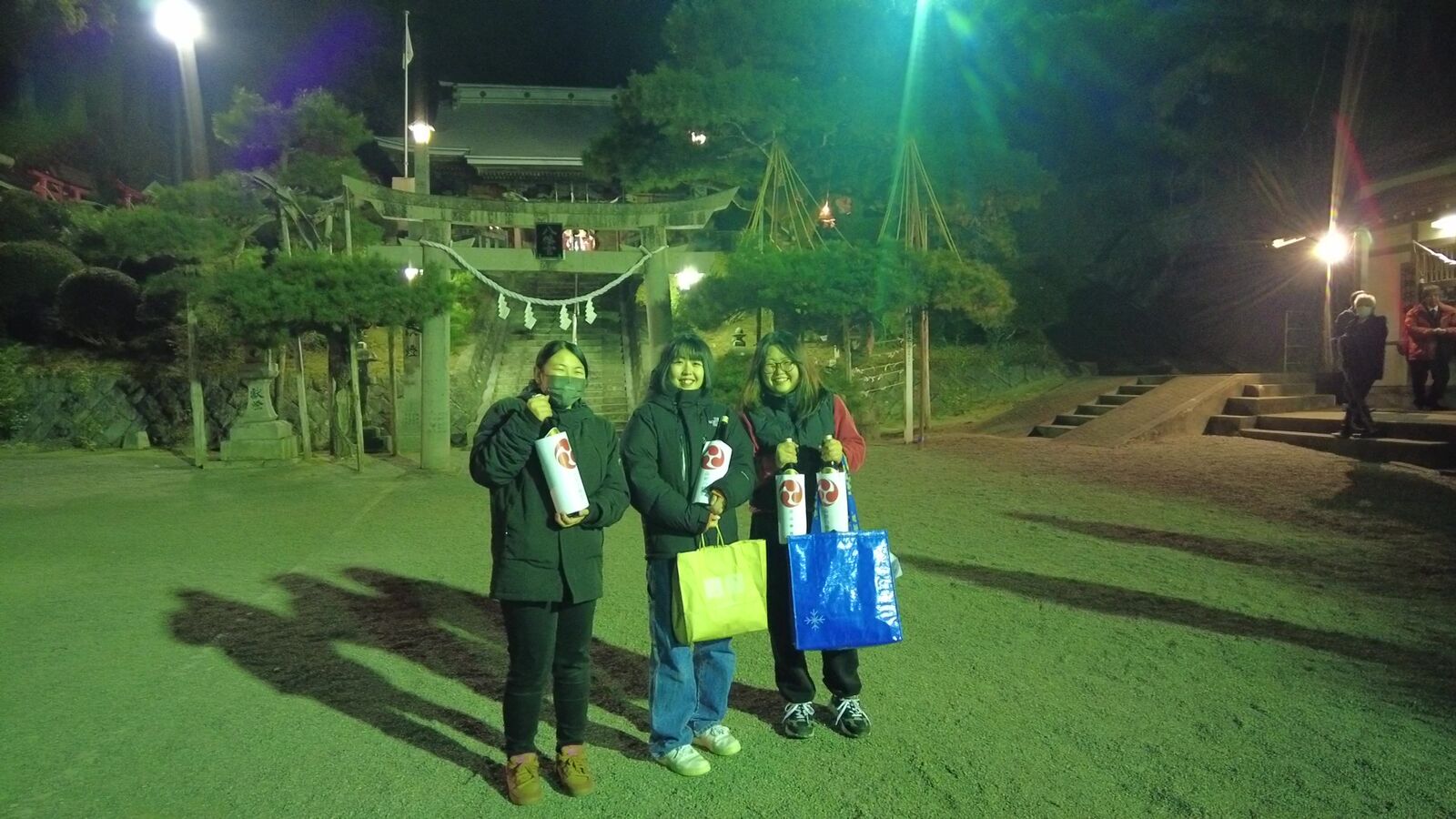 お酒1升瓶を嬉しそうに抱える。女子3人!