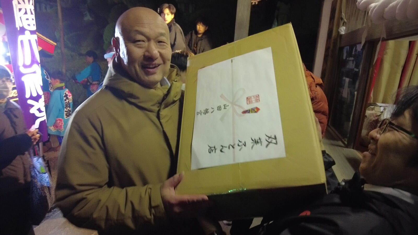 今回1番大きい当たり。長座布団が入った箱をもって、笑顔の男性。
