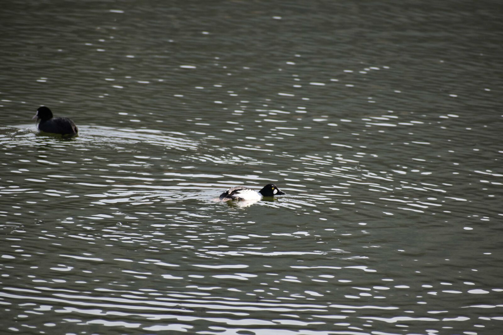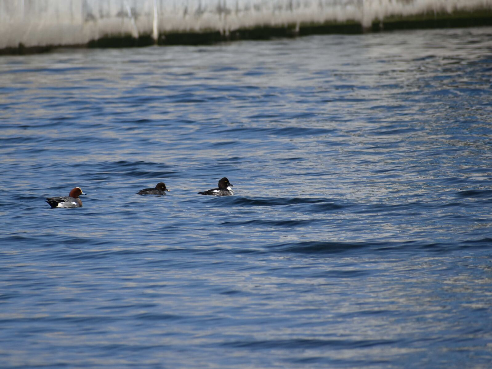 頬に白い模様がまだ出ていない若いホオジロガモが2羽いました。
