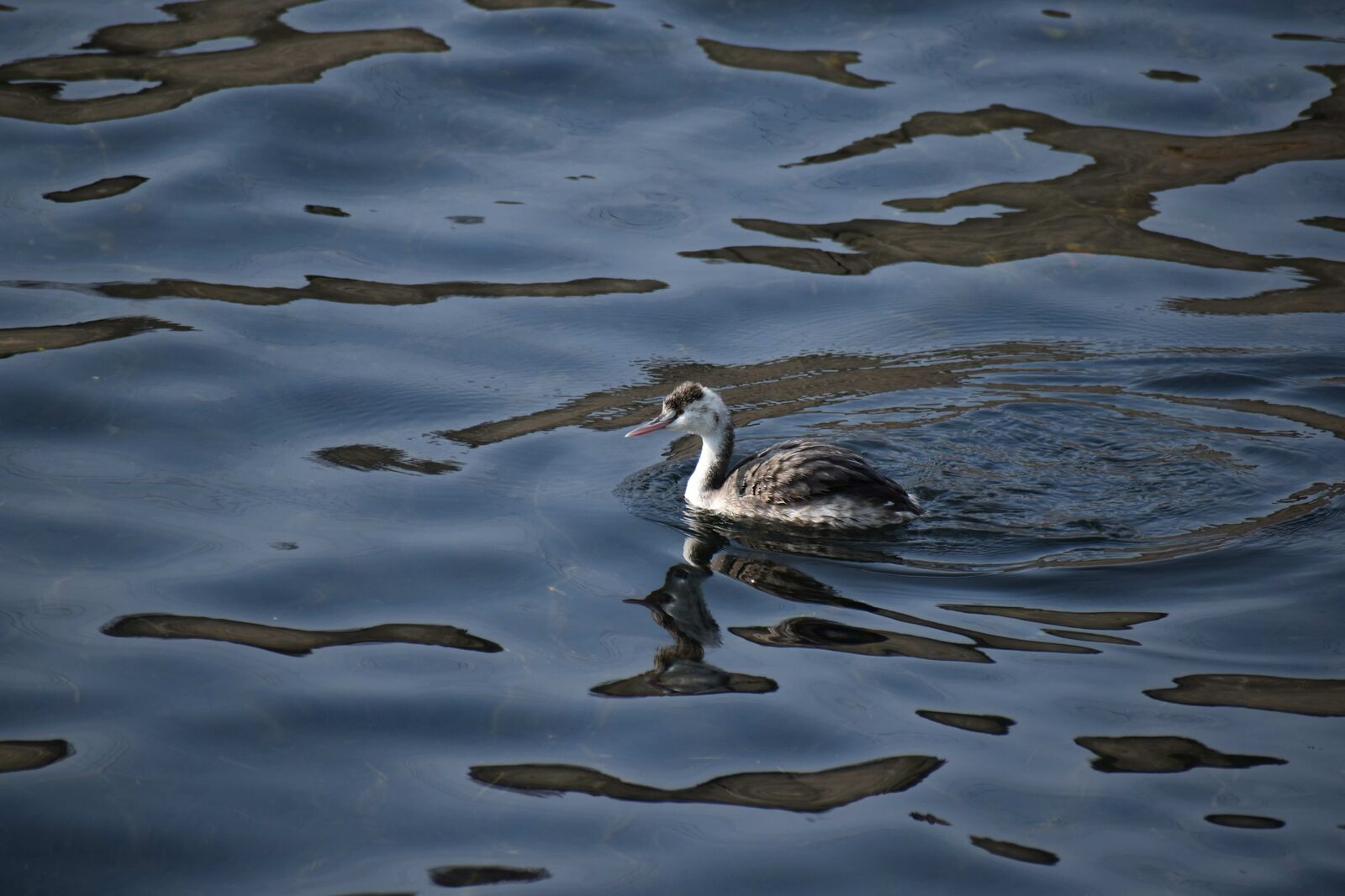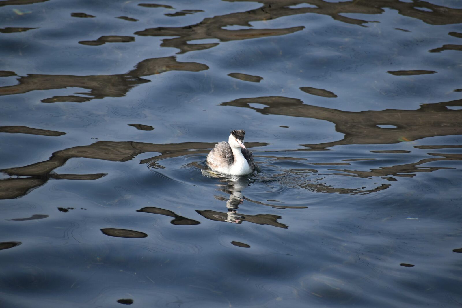 カンムリカイツブリ(冬羽)が浅瀬を潜って餌をさがしていました。