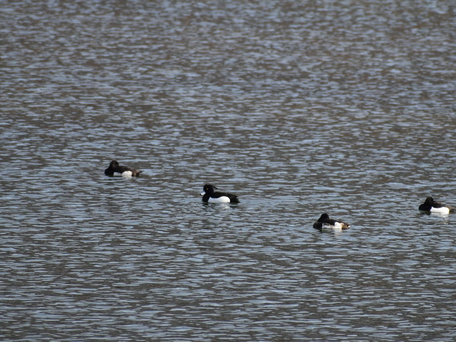 白と黒でくちばしがグレー頭の羽が寝ぐせのように立っている。キンクロハジロ。