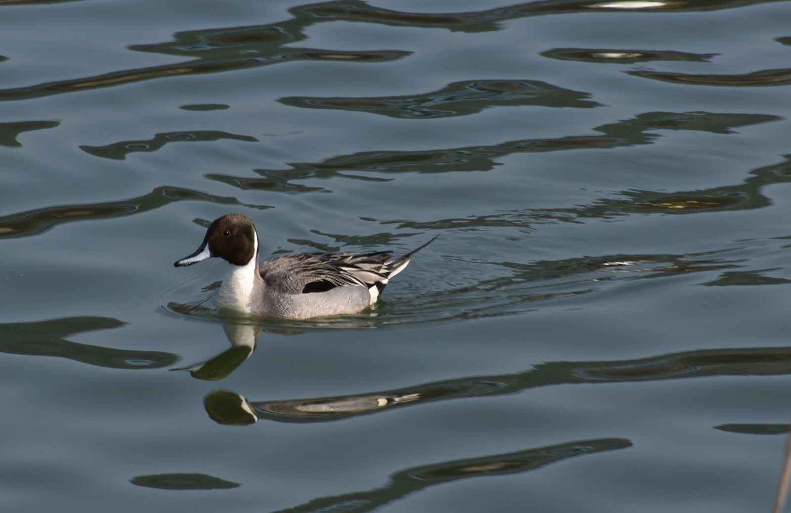 全体に灰色がかっていて、尾が長いオナガガモ♂