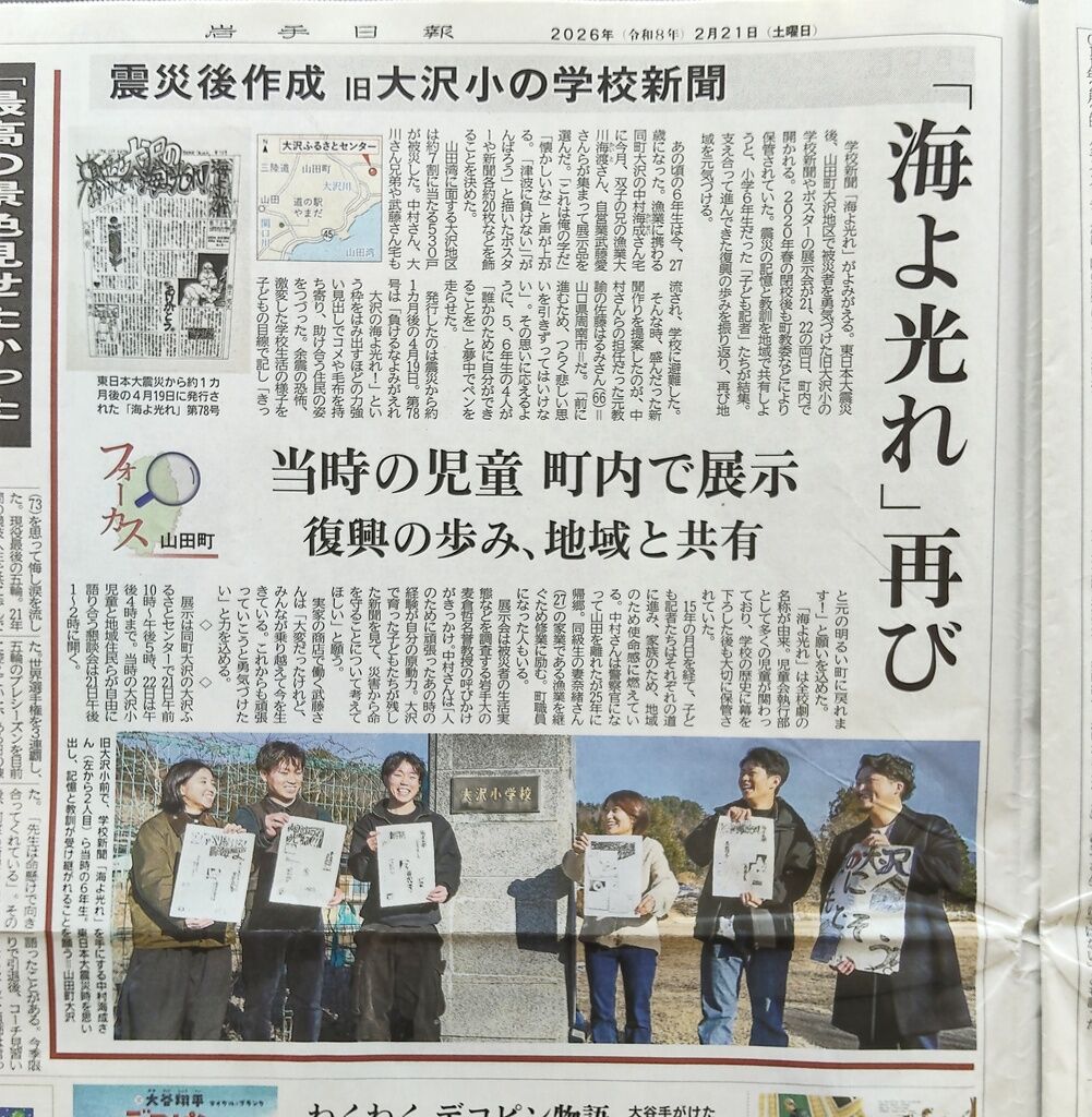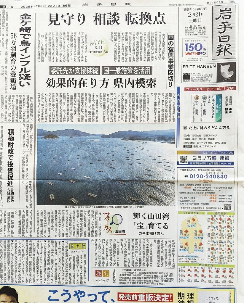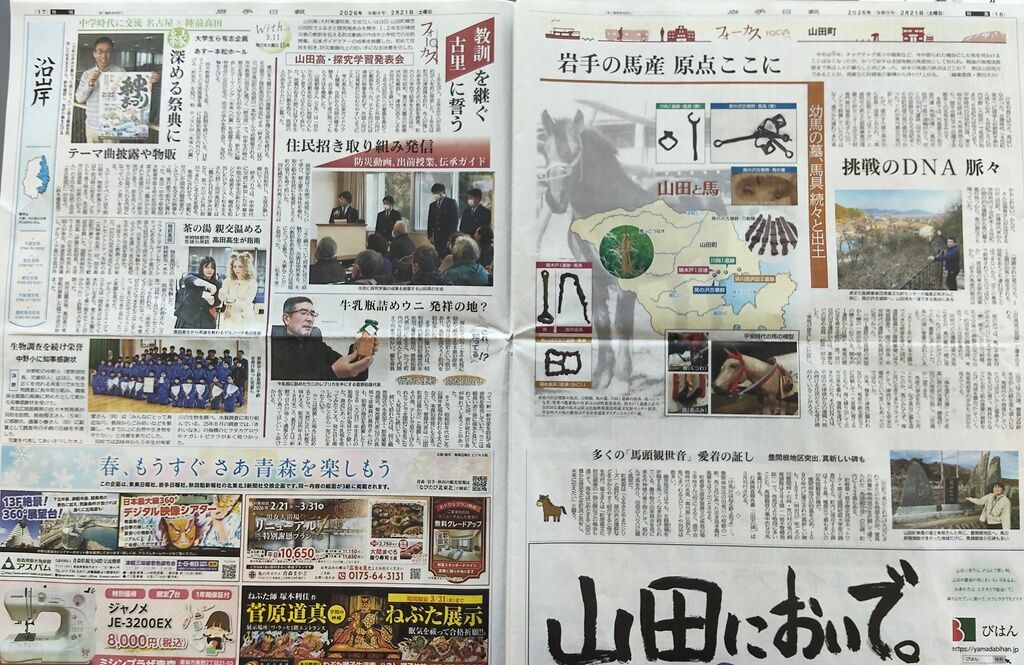 2026年02月23日 2/21の岩手日報に山田の記事 2月21日付け岩手日報に山田町の記事が複数掲載されていました。岩手日報オンラインはこちらhttps://www.iwate-np.co.jp/(無料会員登録で閲覧可能です)(千) タグ :#新聞#岩手日報#記事#海よ光れ#馬#瓶詰めウニ#山田高校 「お知らせ」カテゴリの最新記事 < 前の記事次の記事 > コメント コメントフォーム 名前 コメント 評価する リセット リセット 顔 星 投稿する 情報を記憶