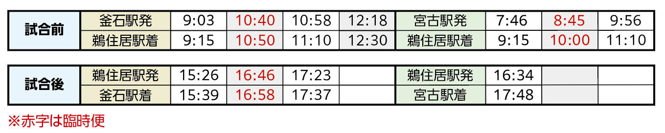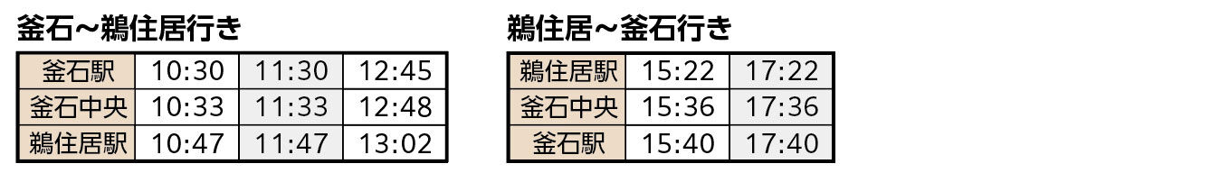 [釜石駅発]鵜住居駅着 9:15、10:50(臨時便)、11:10、12:30